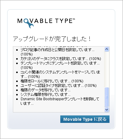 アップグレードが完了しました。「Movable Type に戻る」をクリック。
