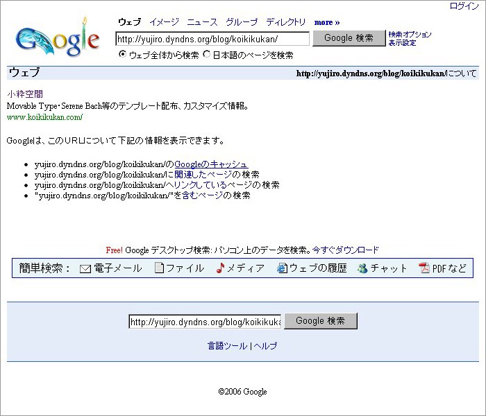 このような場合は、URL(http://~/)をキーワード入力欄に入力します。Google の場合、もし該当サイトのキャッシュが残っていれば、左のようなページが表示されますので、その中の「キャッシュ」をクリックすれば表示されます(スクリーンショットは当サイトの旧URLを入力してみたものです)。