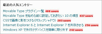 はてなブックマークの「人気エントリー」や「注目エントリー」を Ajax + Perl を利用して、スクリーンショットのように「記事タイトル+被ブックマーク数」のフォーマットでブログ等に表示させるカスタマイズです。