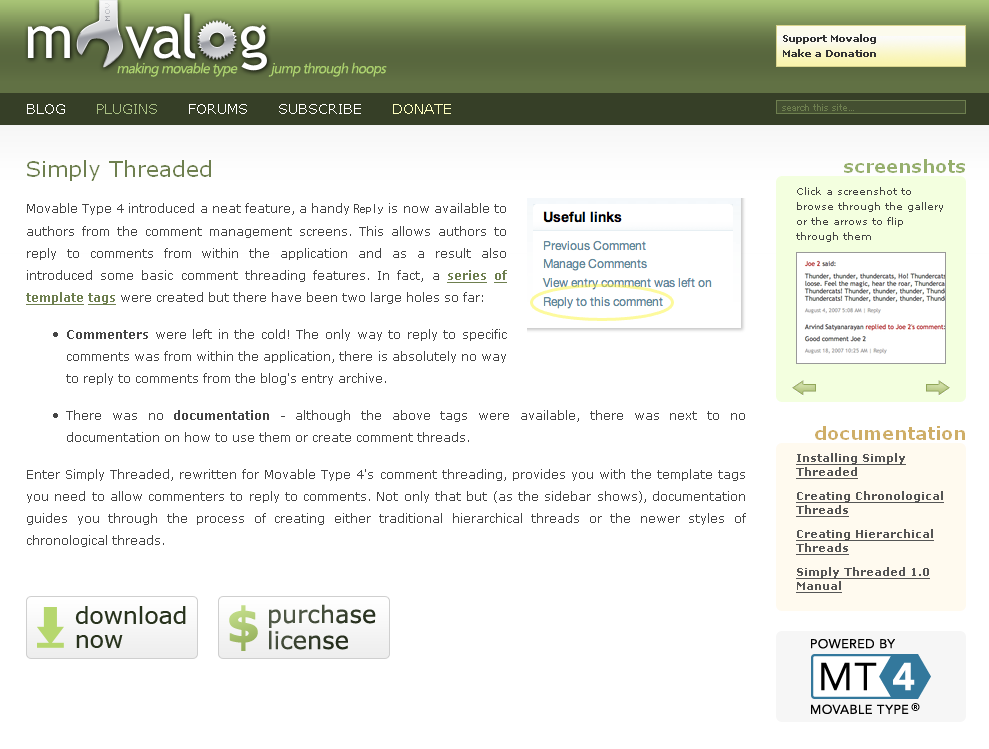 ブログ記事ページのコメントフォームから同様に返信できるようにするには、MT3 の時に紹介した、Simply Threaded プラグインが MT4 対応にバージョンアップされたので、これを利用します。