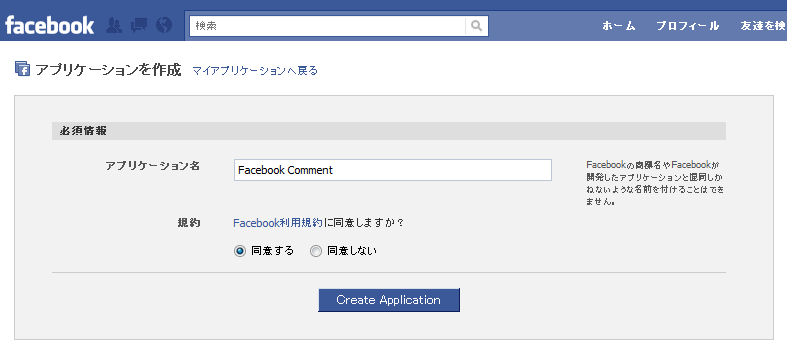 なお、上の例ではアプリケーション名に「Facebook」と入れたため、エラーとなりました。アプリケーション名には「face」という文字を入れてはいけない規定になっています。私の場合、「Movable Type Comment」と入れ直しました。