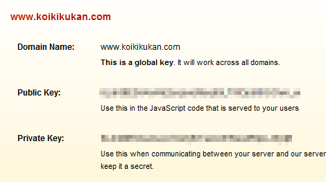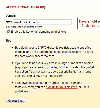 reCaptchaを利用するドメイン(末尾のスラッシュは不要)を入力し、必要に応じて「Enable this key on all domains (global key)」をチェックして、「Create Key」をクリック。
