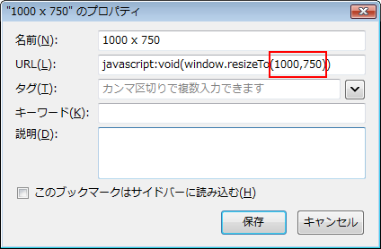 URL欄に表示されているJavaScriptの「1000」「750」を変更して「保存」をクリックします。