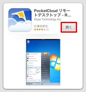 インストールが完了したら「開く」をタップするか、ホーム画面に追加された「Pocket Cloud」をタップします。