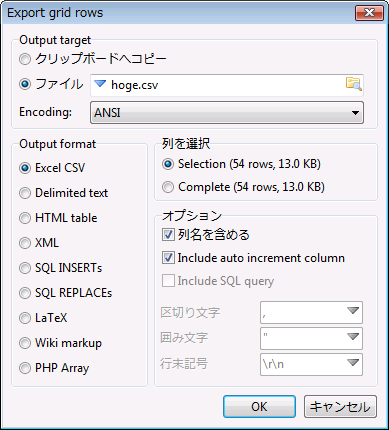 開いたダイアログで「ファイル」を選択してその右側に出力ファイル名、Encodingは「ANSI」、「Output format」は「Excel CSV」を選択し、「列を選択」は「Selection」または「Complete」を選択して「OK」をクリック。