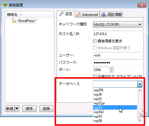 右下の「データベース」から接続するデータベースをプルダウンから選択します。前述の設定が正しくない場合、プルダウンは表示されません。