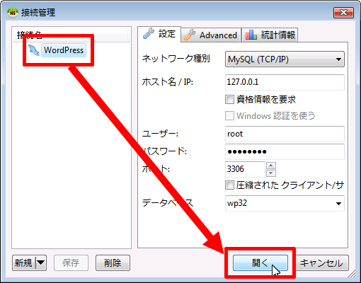 さきほど作成した「WordPress」をクリックして、「開く」をクリック。