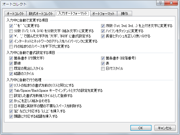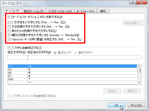 その他のタブにもオートコレクトの項目が数多くあります。参考までにスクリーンショットを掲載しておくので不要な項目はチェックをはずすとよいでしょう。