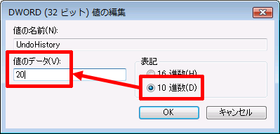 「表記」から「10進数」を選択して「値のデータ」に1~150の値を設定して「OK」をクリック。ここでは「20」を設定します。