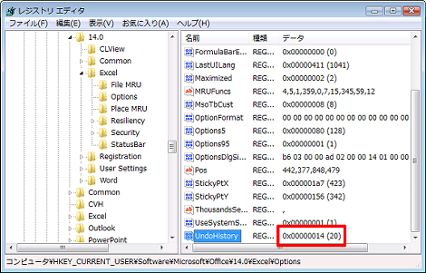 Excelのアンドゥ回数を変更するにはレジストリを編集します。