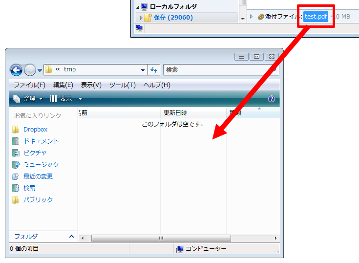 添付ファイルを簡単に保存するには、添付ファイルを右クリックせずに、そのままエクスプローラーやデスクトップにドラッグするだけです。