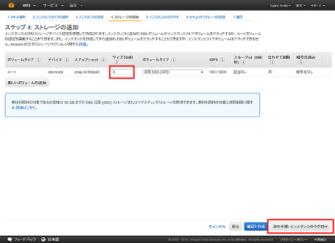 ストレージサイズを設定して、右下の「次の手順: インスタンスのタグ付け」をクリック。ここではデフォルトの「8」のままにしています。