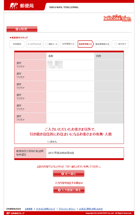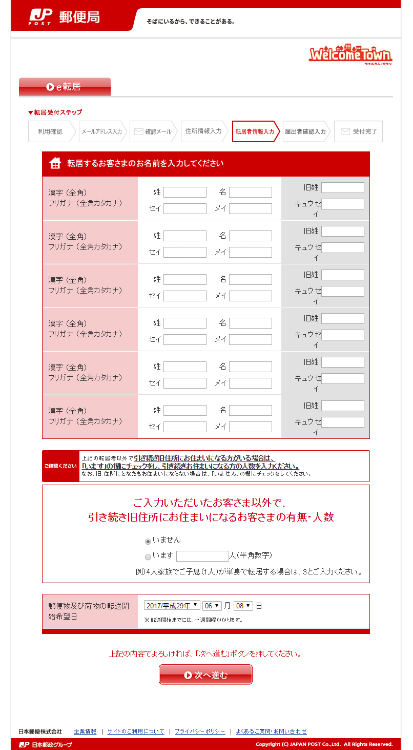 転居する人の氏名と旧住所に残る人数、転送開始日を入力して「次へ進む」をクリック。