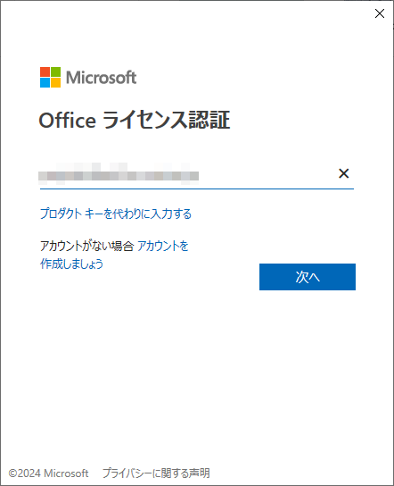 この間の操作を忘れてしまったのですが、再び何かのダイアログが表示され、サブスクの誘惑に屈することなく操作をしていたら下記の画面が出たので、「プロダクトキーを所有している場合」をクリック。