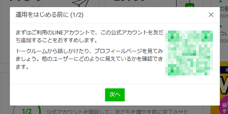 また、ダイアログで友だち追加するよう求められるので、表示されたQRコードを使って、スマホのLINEに公式アカウントを友だち追加しておきます。この友だち追加したLINEアカウントはあとの作業で必要になります。