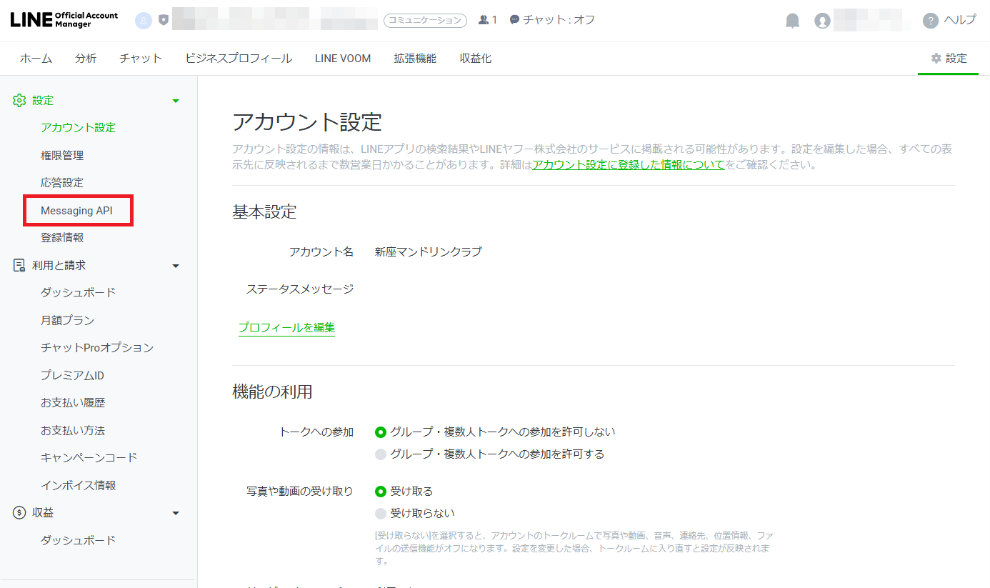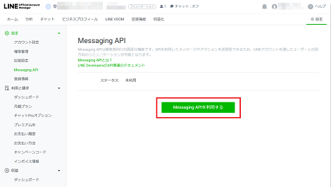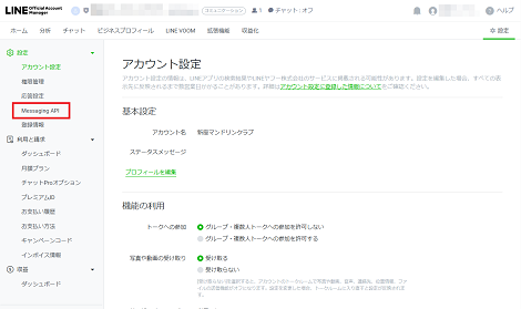 LINE公式アカウントの「Messaging API」の画面を間違って変えてしまった場合、ここに戻ってくる方法ですが、LINE公式アカウント右側の「設定」をクリックすれば、左メニューに「Messaging API」が表示されるので、そのリンクをクリックします。