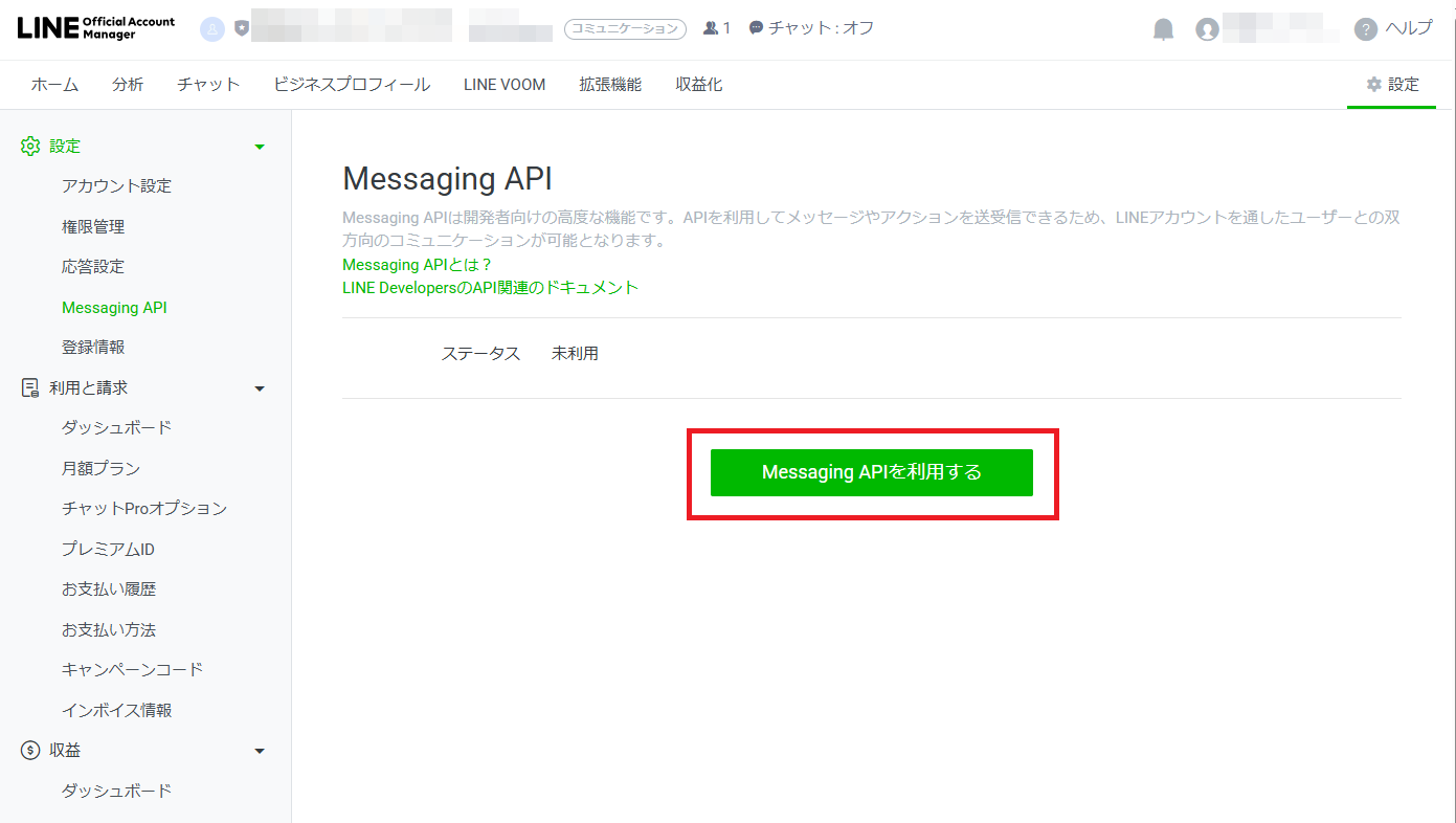 公式アカウントを作成すると(多分)自動的に「Line Official Account Manager」のコンソールになるので、「Messaging API」をクリック。