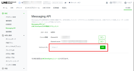 コピーしたURLを、LINE公式アカウントの「Messaging API」の項目に「Webhook URL」に設定、保存します。