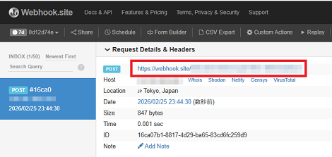 これでこのLINE公式アカウントへのメッセージをWebhookで取得できる状態になりました。このwebhook.siteの画面に情報が表示されるので、このままにしておいてください。