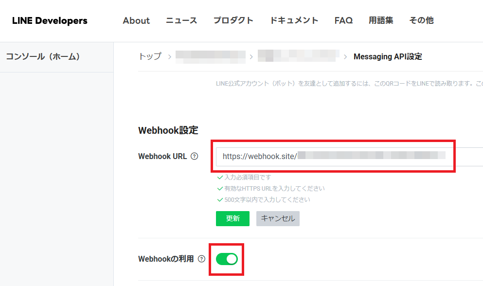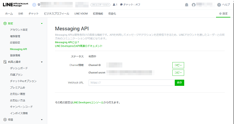 また、LINE Developersにも同じような画面があるので、どちらに設定しても、もう片方に反映されるようです。なお、こちらの画面には「Webhookの利用」というスイッチがあるので、とりあえずオンにしておきました。
