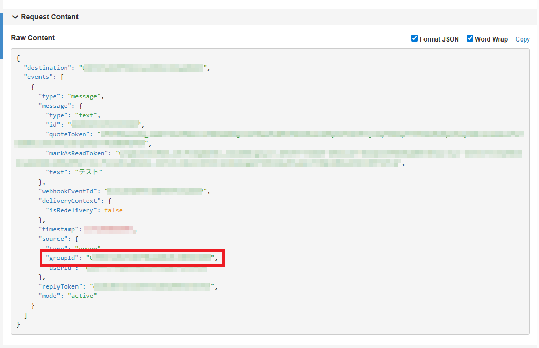 これでグループIDを取得する準備ができたので、③の投稿を行うと、webhook.siteの画面にJSONが表示されるので、その中にある「groupId」の値をコピーしてください。データ取得後、先ほどの「Webhookの利用」はオフにしてOKです。