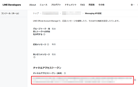 チャネルアクセストークンは、LINE DevelopersのMessaging API画面の下の方にある「発行」ボタンをクリックすれば表示されるので、それをコピーします(画像は発行後のもの)。