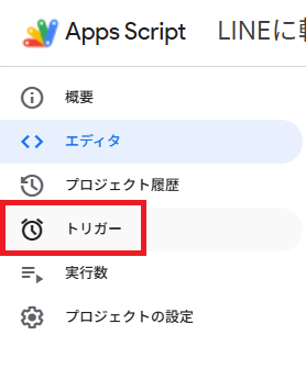 作成したスクリプトの左側にある時計のアイコンをポイントすると「トリガー」が表示されるのでクリック。