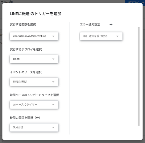 - 起動する関数:上のコード利用であれば「checkGmailAndSendToLine」を選択