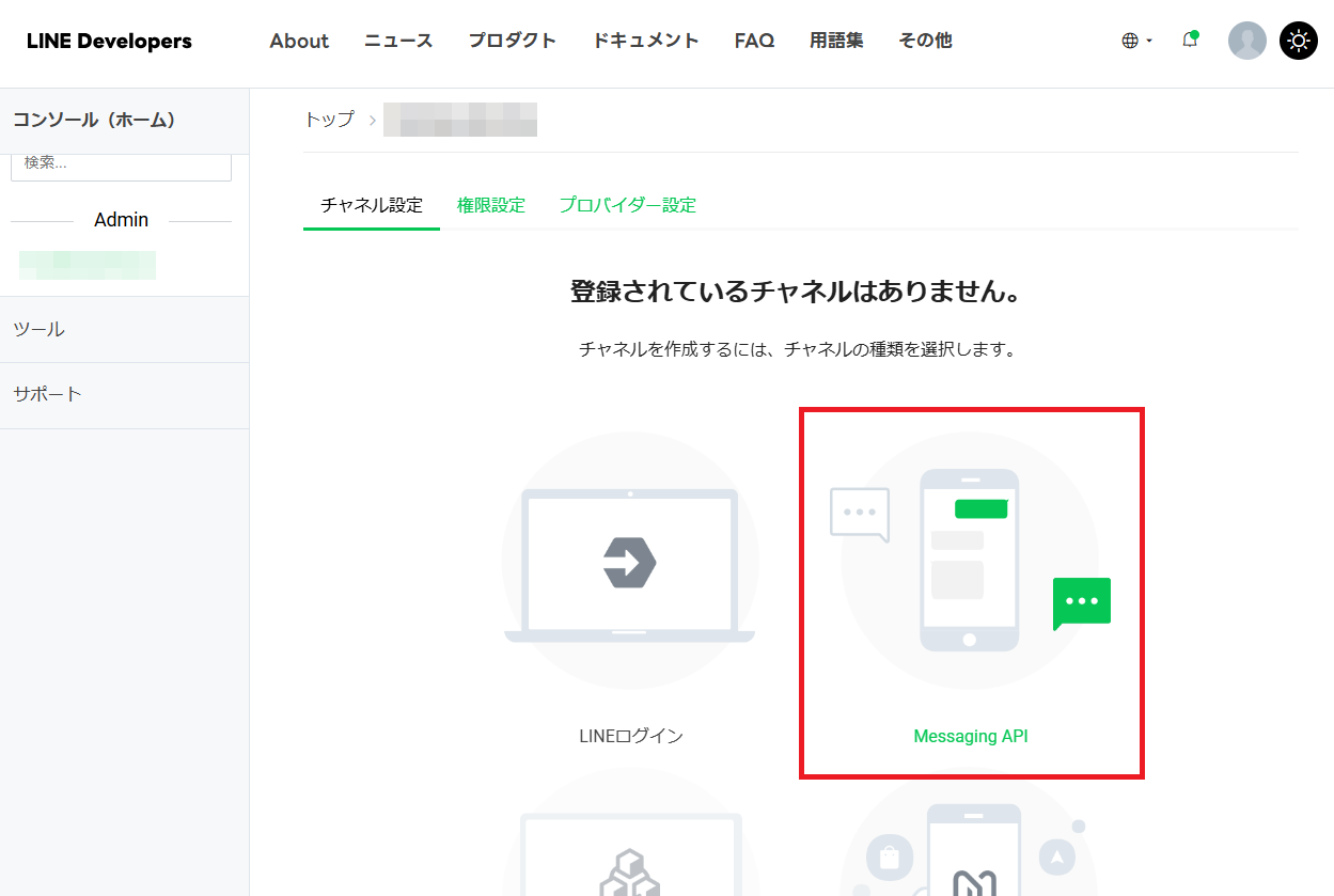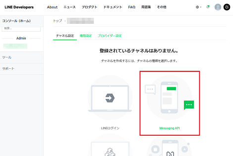(ここまでの画面遷移が曖昧ですが)次のような画面になったら「Messaging API」をクリック。