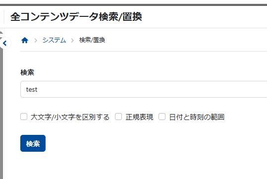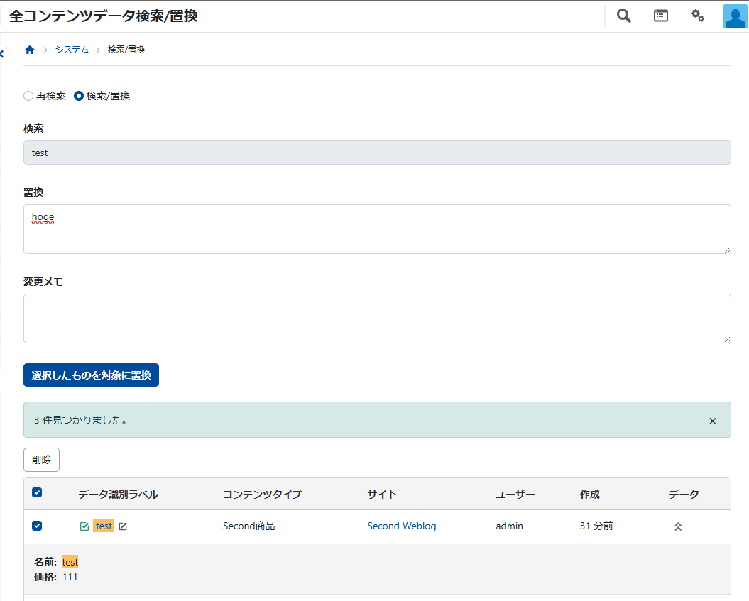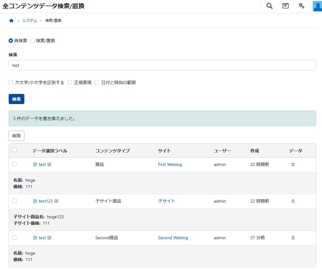 検索文字列にヒットしたコンテンツデータを横断して表示します(下はシステム管理画面からの検索)。