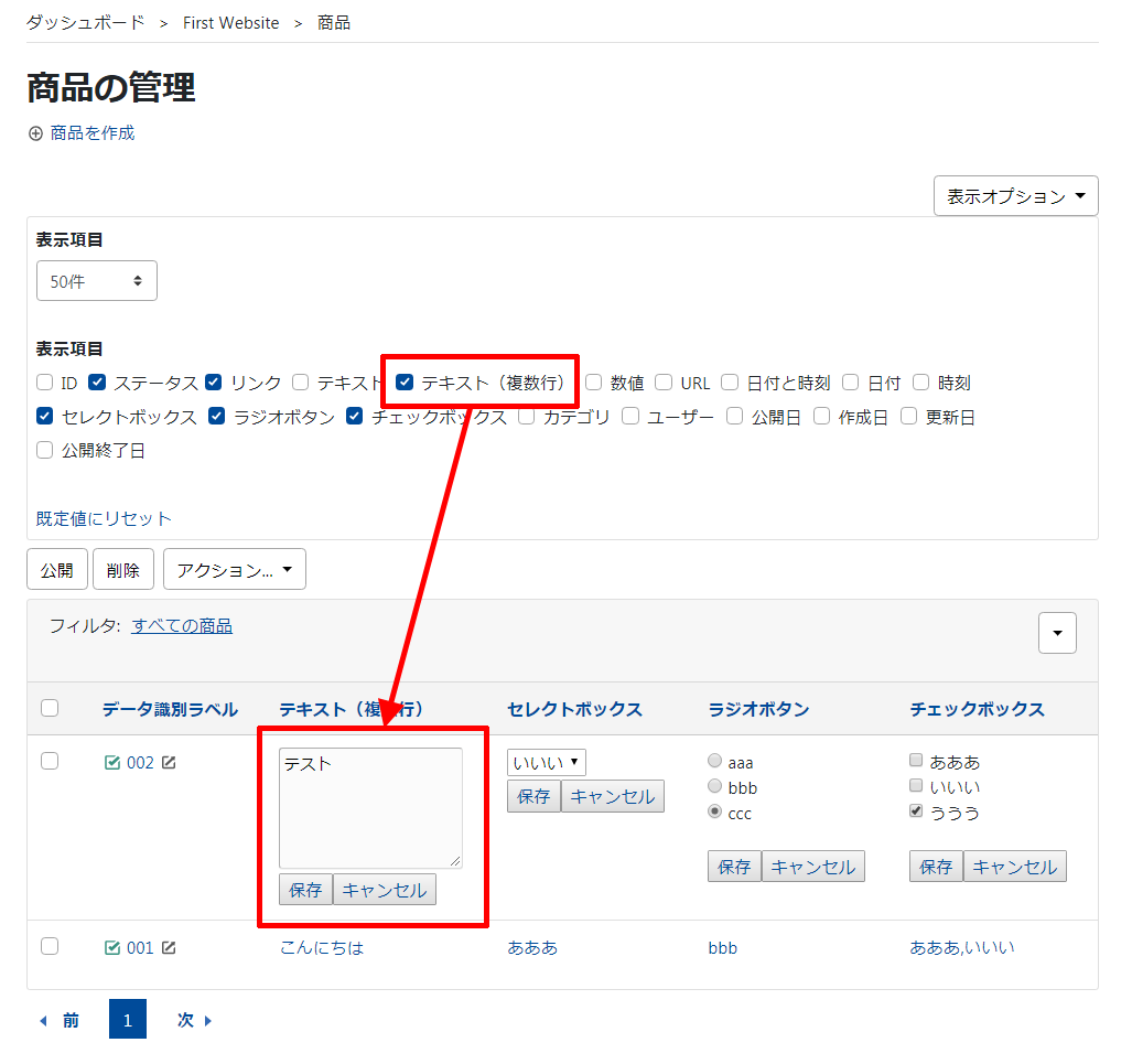 一覧画面のオプションから、編集したいコンテンツフィールドまたはカスタムフィールドをチェックすれば一覧にコンテンツフィールドまたはカスタムフィールドが表示されます。